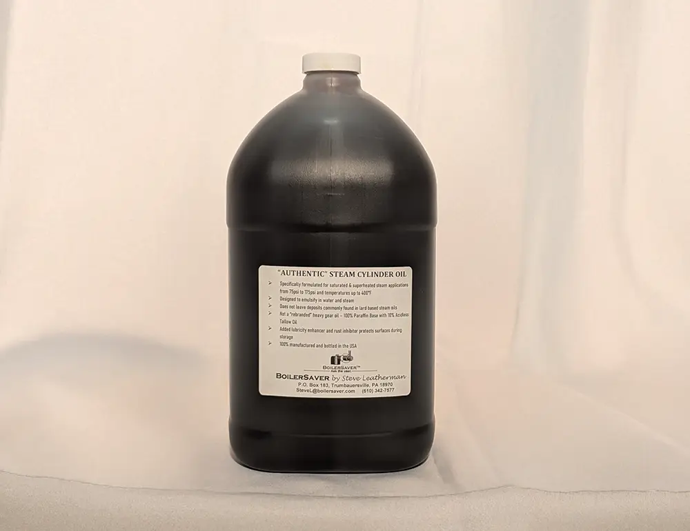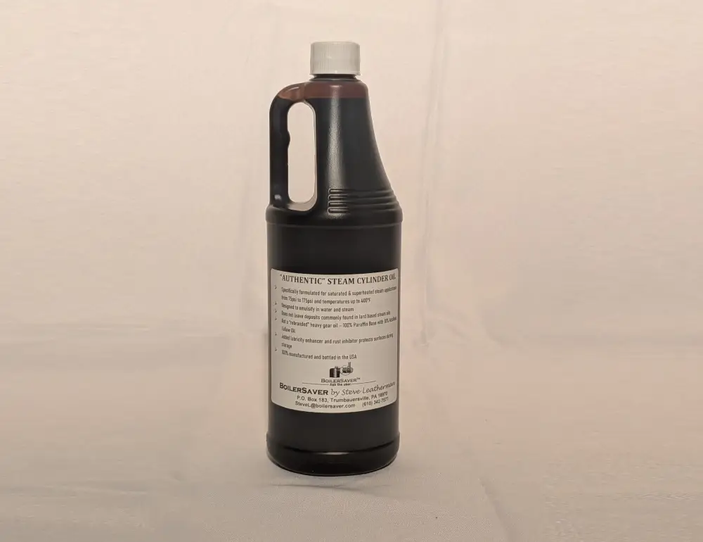 BoilerSaver Steam Cylinder Oil, a USA-made ISO 460 lubricant, supports saturated and superheated steam applications from 75–150 PSI, ideal for locomotives. Formulated with paraffin base and acidless tallow oil, it emulsifies in steam without deposits and includes rust inhibitors. This oil ensures smooth performance for steam enthusiasts.
