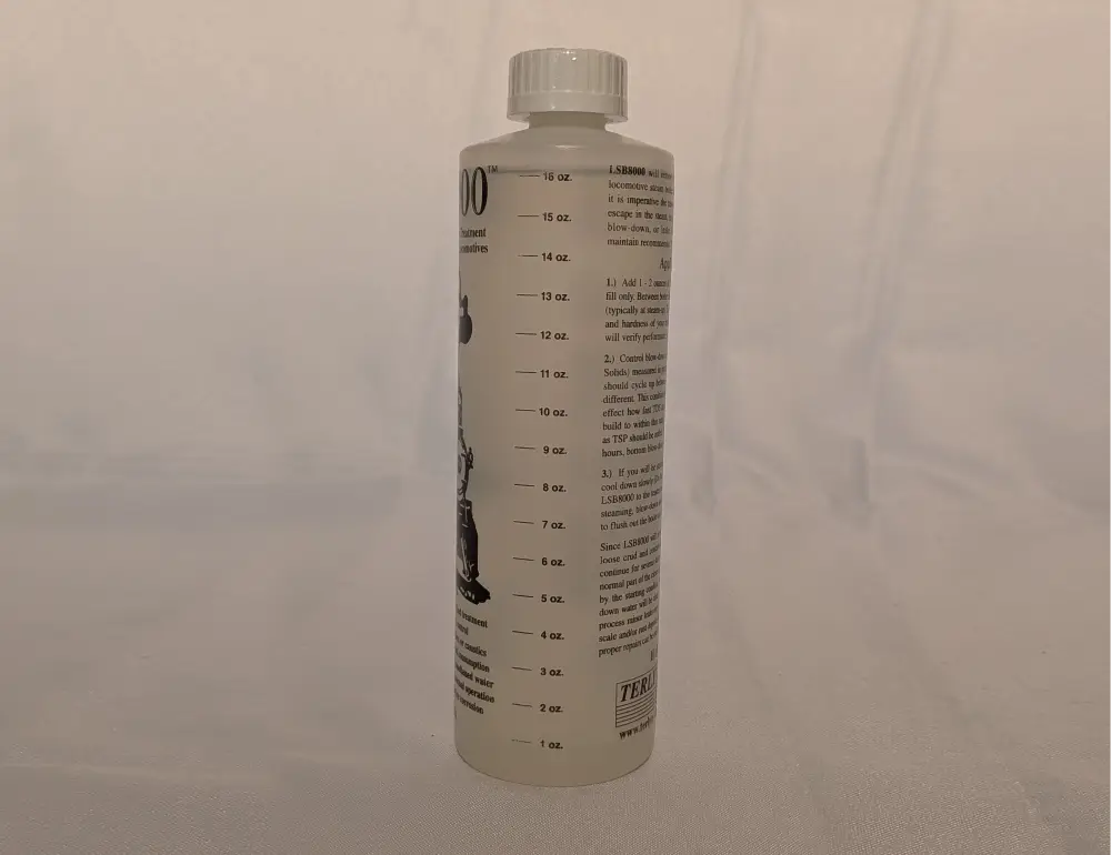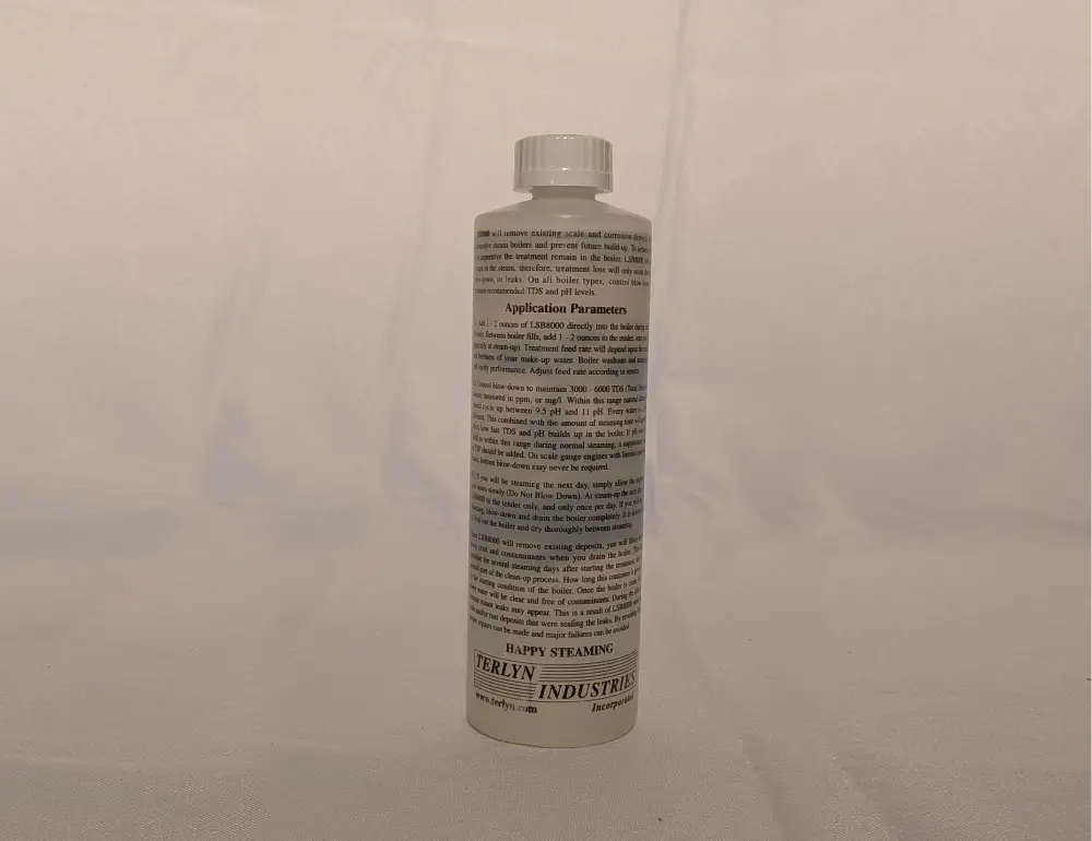Terlyn LSB8000, a USA-made single-feed treatment, controls scale and corrosion in model live steam boilers under 50 gallons, ideal for locomotives up to 15” gauge. This non-hazardous, non-foaming formula removes existing deposits and ensures efficient operation for hobbyists. It works with water up to 70 ppm hardness, extending boiler life without damaging superheaters.
